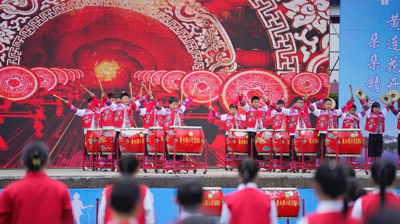 欢快有力的鼓点、中气十足的吼声,走进黄水小学,校园里便传来一阵激昂的锣鼓声响,学校乡村少年宫的腰鼓队员们个个精神饱满,他们动作整齐划一,用铿锵有力的锣鼓声欢迎嘉宾们的到来。操场上,更是锣鼓喧天,几十名学生带来的中华鼓、土家锣鼓表演,热闹非凡。