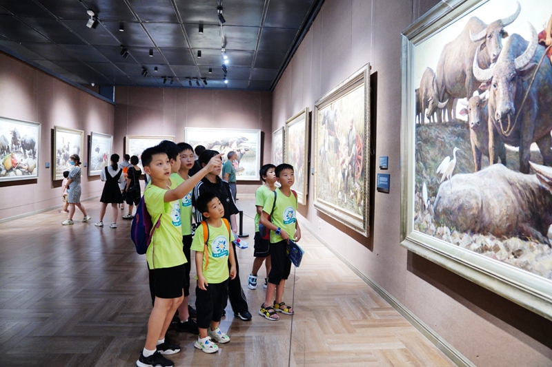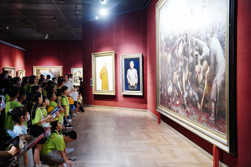 在最后一站李自健美术馆。小朋友们在讲解员的带领下参观画家李自健艺术生涯各个时期的油画作品,其中包括巨幅历史油画《南京大屠杀》以及《乡土系列》《祖母系列》等十七个系列的三百三十余幅作品。