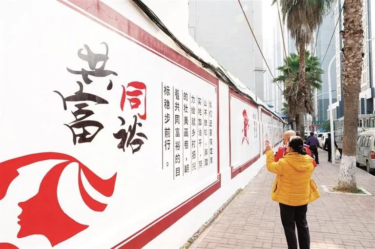 柳江区建设路上,市民在彩绘墙前观看。