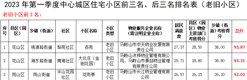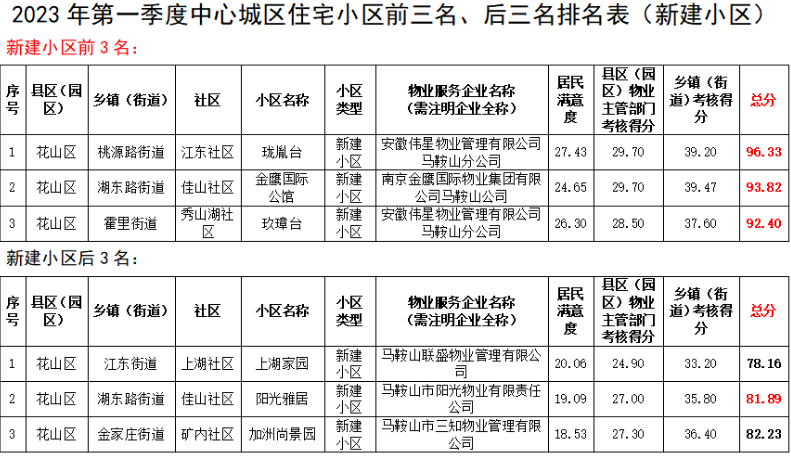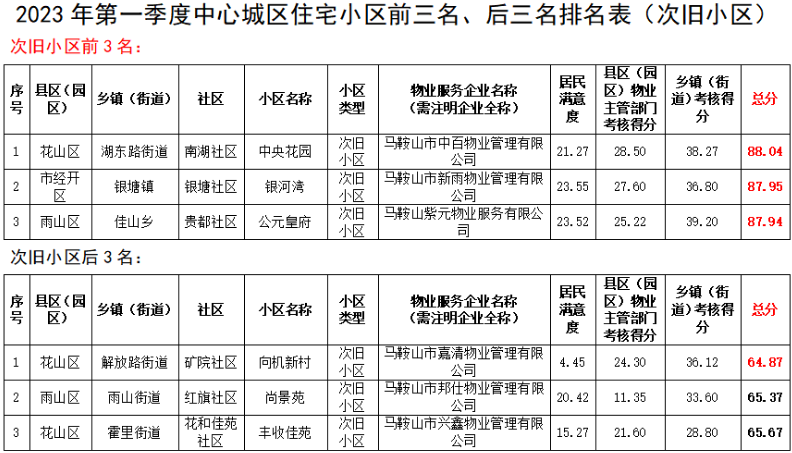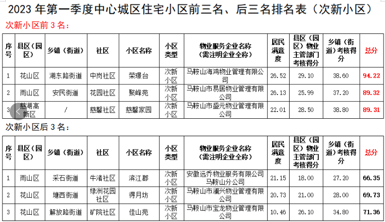 3月23日,马鞍山市住房和城乡建设局发布2023年第一季度马鞍山市物业服务企业及住宅小区“红黑榜”,共有12个小区、5家企业入选“红榜”,另有12个小区、5家企业登上“黑榜” 。