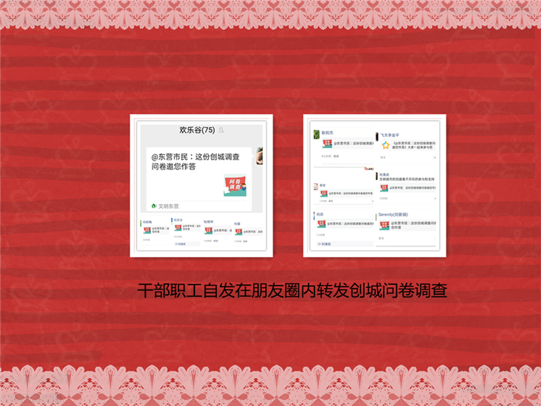 此次广大干部职工的问卷答题及积极转发,充分体现了广大干部职工理解创城、支持创城、投身创城、维护创城,愿意为城市的文明发展发光发热、贡献力量。