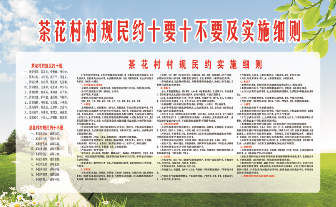 茶花村定期召开村民代表大会,根据发展阶段对村规民约进行修订完善,将社会主义核心价值观、中华民族优秀传统文化、禁止滥办酒席等内容纳入村规民约。同时加强对村务的监督,进一步做好村规民约建设工作。