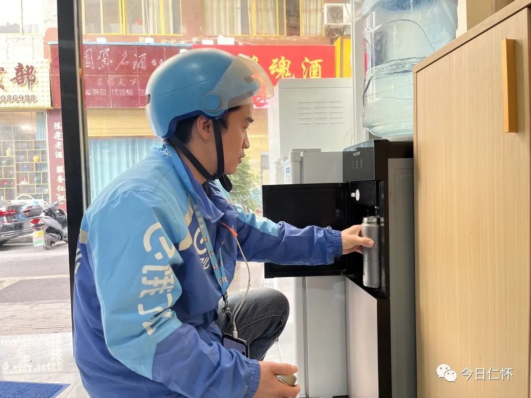上午10点,完成20单配送任务的饿了么外卖骑手王飞来到“酿蜜驿站”,用自己随身携带的水杯接了一杯热水,坐在椅子上一边休息,一边刷着订单信息。